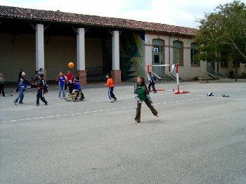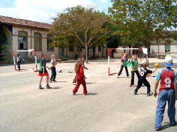 Garonne dans la cour de l'école, pour faire une rencontre de hand-ball.